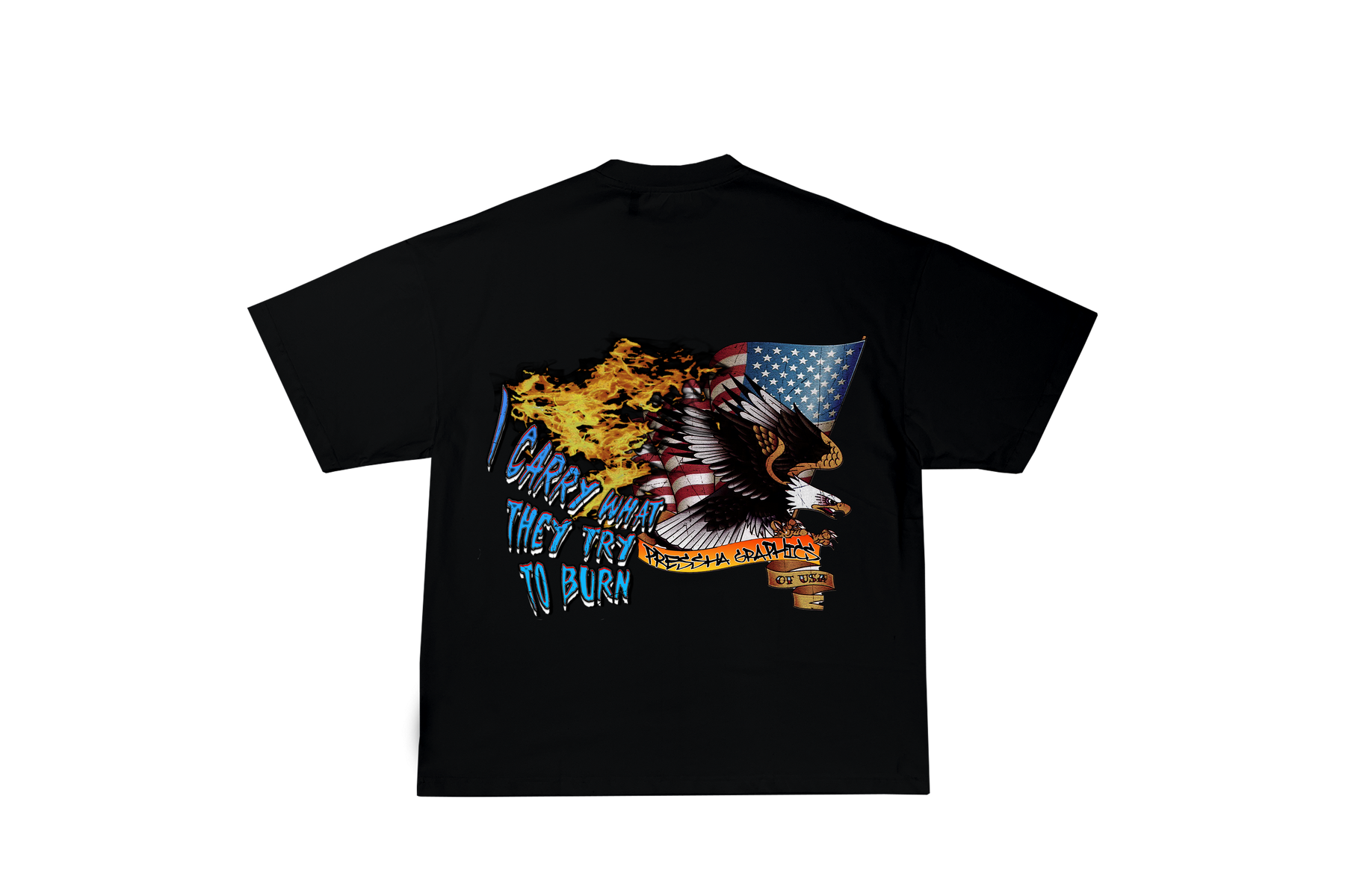 The tee features a front graphic of a duffel bag surrounded by flames — trying to burn but refusing to succumb — carrying the essence of PRESSHA and New York. Layered within the base of the 1999 numbers (the year PRESSHA was established) are hidden details: masked figures holding the American flag, a bomb, camo patterns, leopard print, mirrored flags, and hints of gold outlining the stars and numbers. This intricate design embodies the message: “I carry what they tried to burn.”